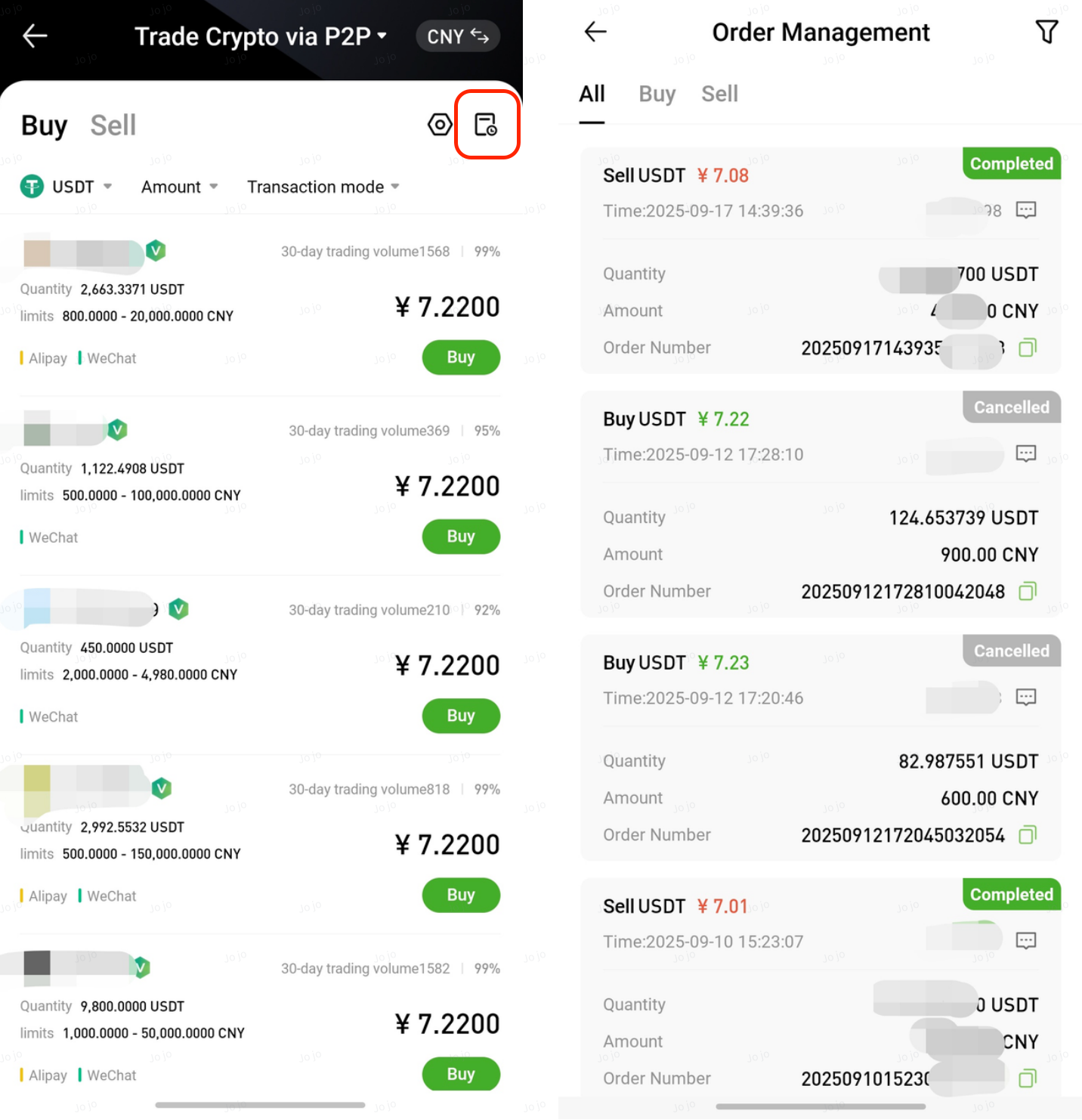 Go to P2P Trading and tap Orders in the upper-right corner.