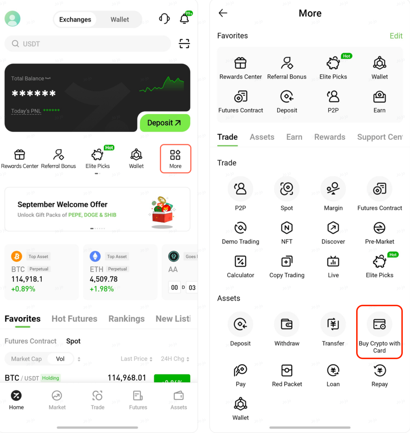 On the homepage, tap More, then select Buy Crypto with Card under the Assets section.