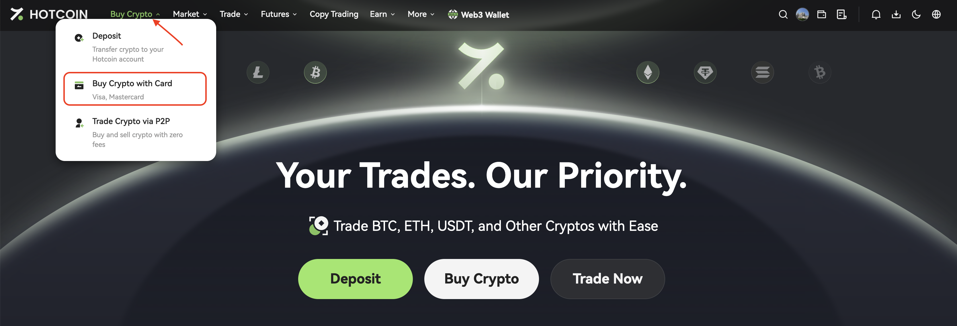 Log in to the Hotcoin website and navigate to Buy Crypto → Buy Crypto with Card.