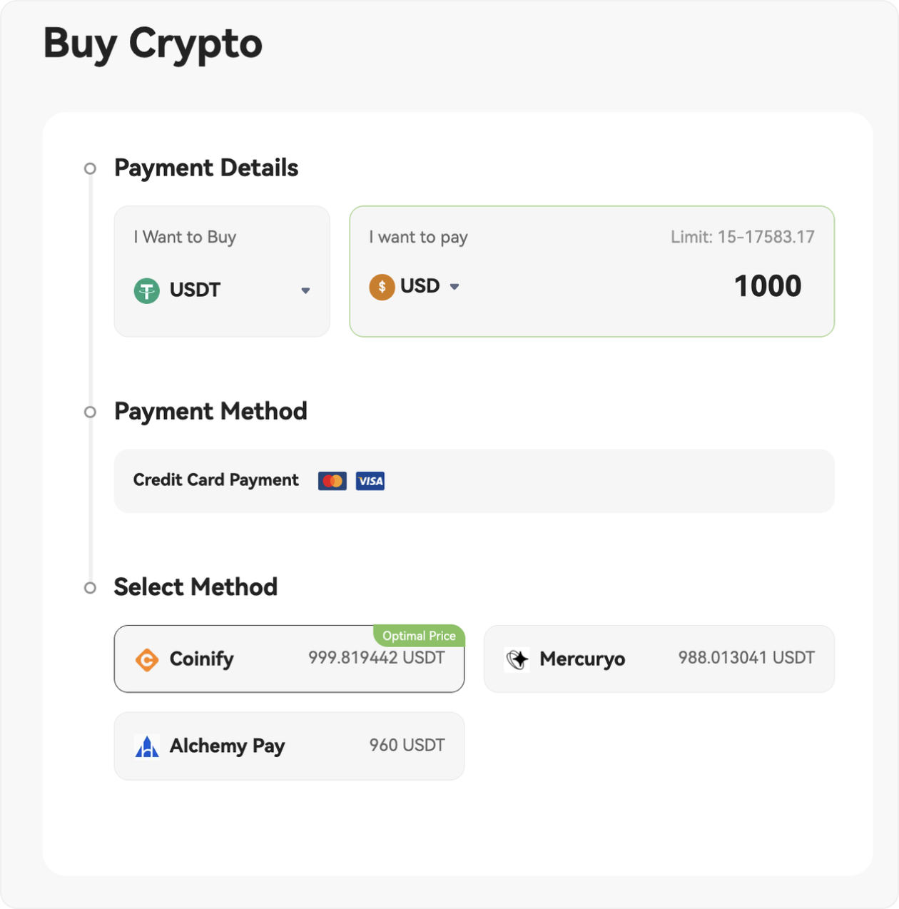 On Hotcoin, you can purchase cryptocurrencies directly using credit cards, debit cards, or local payment methods through third-party providers such as Coinify, Simplex, and Alchemy Pay without the need to deposit fiat in advance. Once the purchase is completed, the assets will be automatically credited to your Hotcoin account.